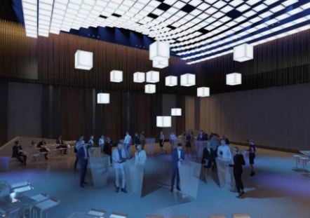 上海國際傳媒港多功能廳的燈光設計借鑒廣播電視演播室、文化科技場館的設計理念,具有靈活性和可實現(xiàn)性,考慮到多功能廳空間上方有動態(tài)雕塑屏作為頂部特殊造型給燈光吊掛系統(tǒng)增加難度的現(xiàn)實問題,燈光設計單位在此空間基礎上懸掛了多臺舞臺電動葫蘆解決燈光吊掛難題。