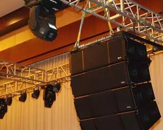 其次在一個(gè)音響工程吊裝的牢固度直接關(guān)系到廳堂內(nèi)的安全性。會(huì)議音響裝飾格片的寬度應(yīng)小于所裝音箱紙盆直徑的1/10,格片的開(kāi)口率應(yīng)大于75%,演出音響裝飾格片好做成楔形,有利于聲波的傳播與擴(kuò)散。